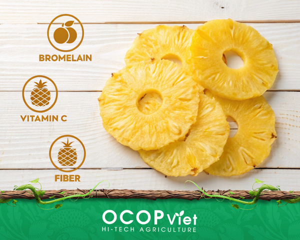 Thơm vốn nổi tiếng với enzyme bromelain – loại enzyme quý giá có khả năng phân giải protein, giúp hệ tiêu hóa hoạt động nhẹ nhàng hơn. Khi được chế biến thành thơm sấy dẻo, dưỡng chất này vẫn còn giữ lại đáng kể.
