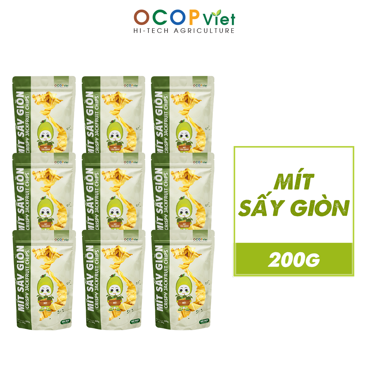 Mít sấy OCOP Việt được chế biến từ những trái mít chín cây tuyển chọn kỹ lưỡng tại các vùng nguyên liệu sạch. Sau khi sơ chế, múi mít được sấy bằng công nghệ hiện đại ở nhiệt độ thấp giúp giữ nguyên màu sắc, hương thơm và độ ngọt tự nhiên. Thành phẩm giòn tan, không dầu, không chất bảo quản, thích hợp làm món ăn vặt tiện lợi cho học sinh, dân văn phòng hoặc người đang cần chế độ ăn lành mạnh.